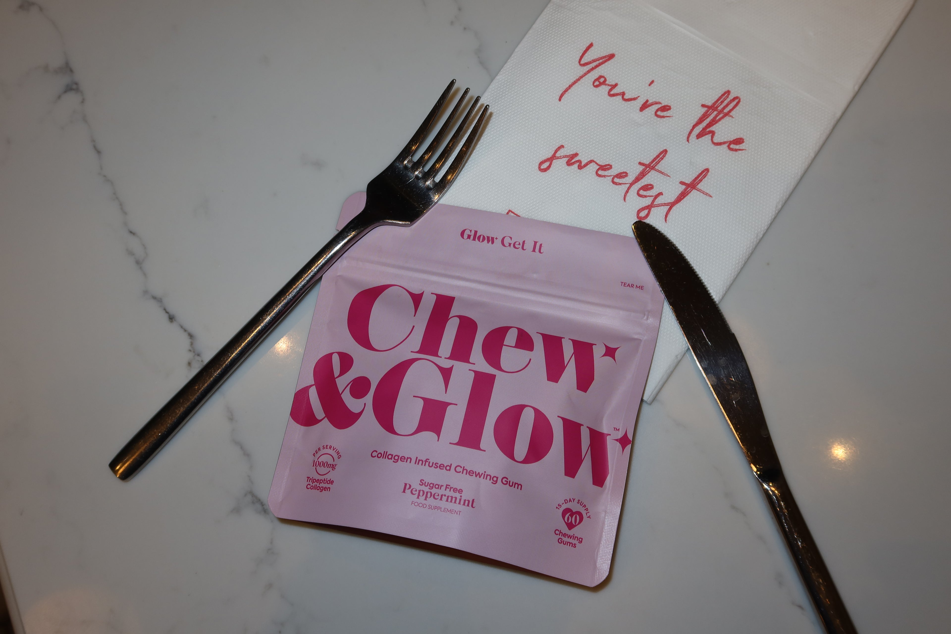 Tripeptide Collagen infused chewing gum, a first to UK market revolutionising the way we take collagen.